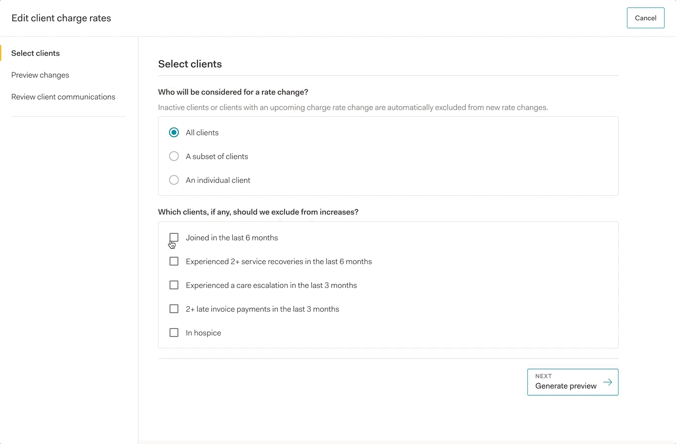The guided flow matches the owner’s mental model in deciding which clients are ready for a rate change, and it acts as a sandbox for owners to view in real-time how certain changes affect business projections overall as well as on an individual level, similar to what is seen in the BRT. Internally, we can start to gather how client filters may relate to rate increases and understand the reasons behind the change.